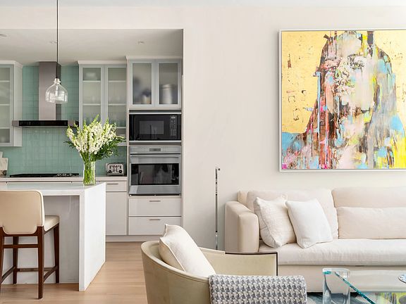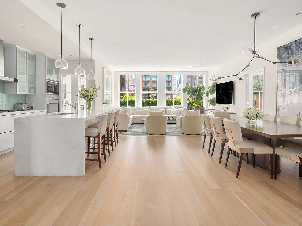 Entering this residence directly from the key locked elevator, you are immediately struck by the unobstructed south-facing view, including neighboring landscaped rooftops and One World Trade Center. The expansive great room is perfectly laid out for dining and entertaining, with ceiling heights up to 10' feet and a wall of 8' foot tall Kolby & Kolby sash windows allowing natural light to pour in. The contemporary, open chef's kitchen boasts top-of-the-line Miele, Wolf and Sub-Zero appliances, a beautifully-crafted marble breakfast bar and glass-tiled artisan backsplash. Just off the foyer sits an antiqued-mirror clad bar with a neatly tucked away coat closet, as well as a crisp, bright glass-tiled powder room.
