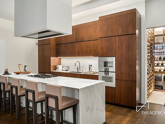 The open kitchen is equipped with a suite of Gaggenau and Miele appliances, is clad in thick Bianco Borealis marble and custom walnut cabinetry, vents externally and features an oversized island ideal for entertaining. Just off the kitchen, a temperature-controlled cave-a-vin offers storage for nearly 600 bottles.