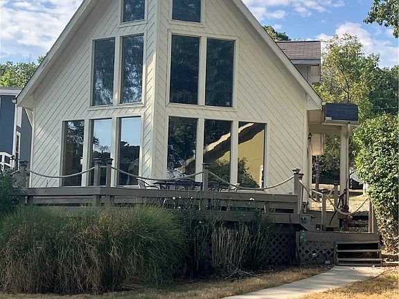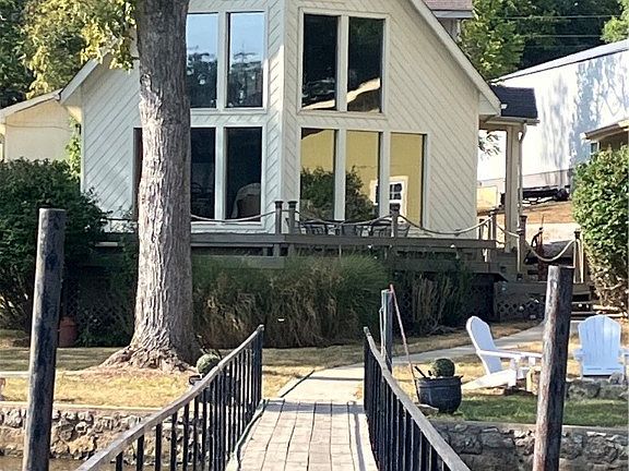 LEVEL LEVEL LEVEL! A wall of windows and vaulted ceilings. Main level living! **SELLER MOTIVATED** Big view from this COVE location of the main channel. Primary bedroom and bath on the main level and a large guest bedroom and loft bedroom on the second level with a full bath. New granite counters in the kitchen, newer stainless steel appliances, newer light fixtures and ceiling fans. Two car attached garage. Enjoy the sun coming up in the mornings and shade on the large deck in the evening. Large dock included.