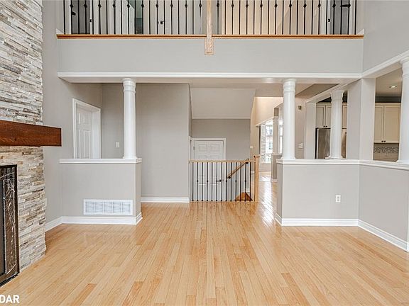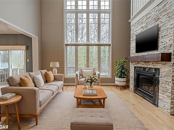 SPACIOUS BUNGALOFT IN A SOUGHT-AFTER NEIGHBOURHOOD STEPS TO GEORGIAN BAY! Just steps from the shoreline of Georgian Bay and backing onto a scenic trail that leads to the waterfront, this bungaloft brings space, style and serious curb appeal. Set in a highly sought-after, family-friendly neighbourhood surrounded by parks, a marina, restaurants, schools and everyday essentials, this home makes everyday living feel like a getaway. The eye-catching stone and siding exterior features arched dormers, a double-door entry and a charming front porch, while inside offers over 3,000 square feet of finished living space filled with tasteful, contemporary finishes. The kitchen impresses with white cabinetry, stone countertops, a tiled backsplash, stainless steel appliances and pot lights, opening into an airy great room with soaring ceilings, a cozy fireplace and an incredible two-storey window that frames the serene wooded backdrop. A bonus living room at the front of the home offers timeless wainscotting and arched windows with shutters. The main floor also features a powder room, convenient laundry room and access to the attached double garage with a double-wide driveway for extra parking. The primary suite is tucked away with a walk-in closet and 4-piece ensuite, while two additional upper-level bedrooms are thoughtfully positioned on opposite sides of the open balcony and share a 4-piece bathroom. The fully finished basement brings versatility with a large rec room, bar area, full bathroom, den, office and generous storage. Step outside to a fully fenced backyard with a walkout to the deck and soak up the peaceful surroundings in this truly unforgettable #HomeToStay!