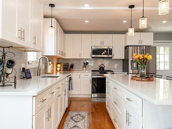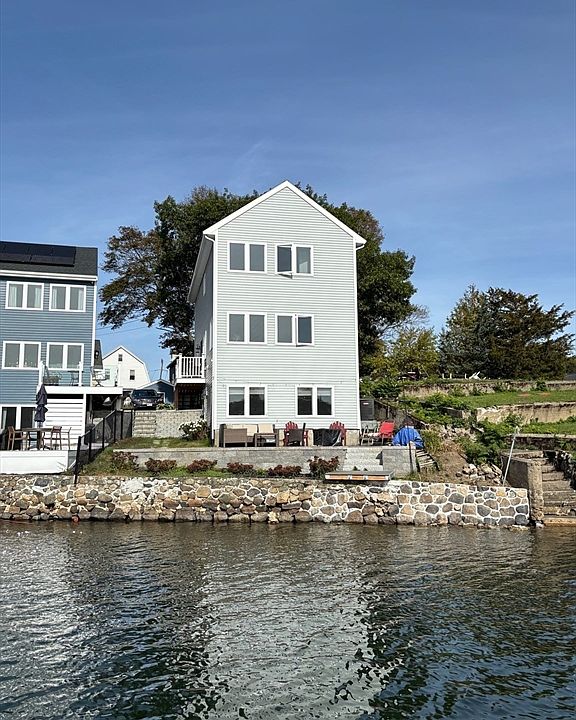 Sluice Pond Waterfront, unique Condo offering approximately 1861 sq. ft of living. Open concept with 3 full baths and 1 half. The kitchen and living area are all open and overlooking the pond with gorgeous views, Stainless appliances, 9 foot island with stools to remain, white quartz counter tops. Upstairs has two good-sized bedrooms with piggyback laundry in hallway, two full baths, great closet space, front bedroom overlooks the pond, hardwood floors on first and second floors, Lowe level is a huge family room with wood floors, five windows with continuous views, a private side entrance which leads to patio. Enjoy all the fun that goes with living on a pond from boating, swimming, skating, to fishingand more. Two condos in complex, parking for three cars, dead end street close to Broadway. No condo fee. Only expense is master insurance 50/50.