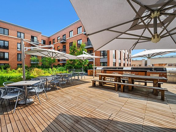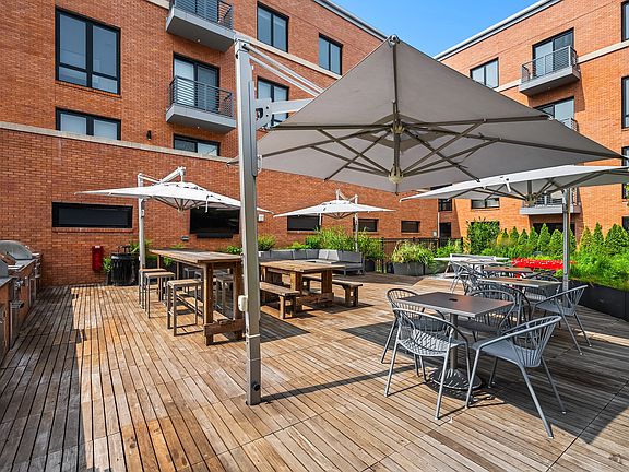 An impressive 10,000 SF landscaped courtyard featuring a barbecuing area with three full-size grills for resident use, a pet walking area, seating areas and game spots.