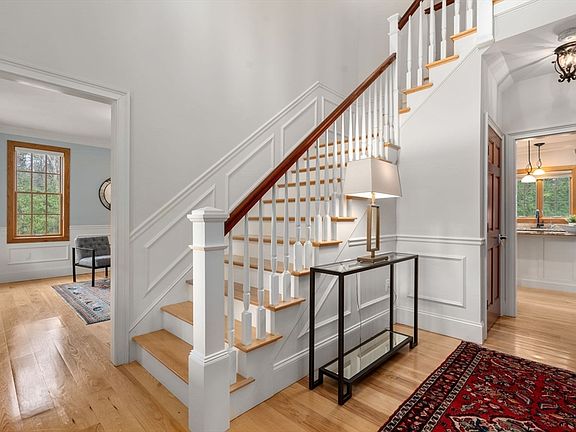 A private cul-de-sac neighborhood abutting conservation land with scenic walking trails. This stunning home has been immaculately maintained and upgraded by the current owners. Enter the foyer with a soaring cathedral ceiling, leading to a gourmet kitchen that flows into a cozy family room with a fireplace. The adjoining dining and living rooms are perfect for entertaining. A large office with custom cabinetry and a half bath complete the first floor. Upstairs, the primary bedroom is spacious, with a sitting area, two closets, and an ensuite bathroom with a large shower and whirlpool tub. An additional three bedrooms, one with an ensuite bathroom, a full bath, and a laundry room complete the upstairs. The finished walkout basement is wired for a home theater and boasts a custom-built bar area, wine and beverage fridges, a gym, a play area, and full bath. The fenced yard is accessible from a deck off the kitchen leading to a patio with fire pit, lights and thoughtful gardening.