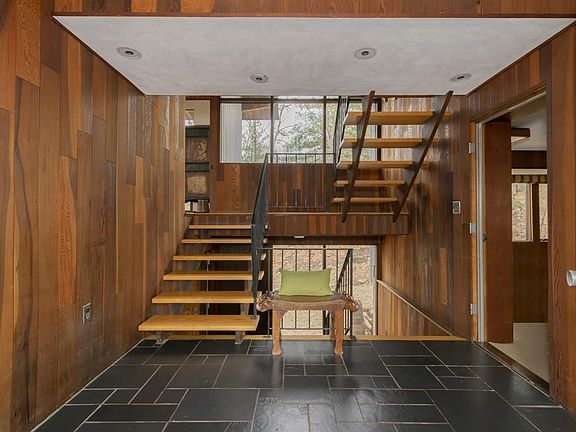 A hidden gem, tucked away in a tranquil, wooded setting. Welcome home to stylish and contemporary living with an open floor plan, sweeping cathedral ceilings and walls of glass. Prepare to be amazed as the main living area unfolds with a show-stopping, open-concept space where the formal living room, dining room, and kitchen blend seamlessly for comfortable living and effortless entertaining with a central brick fireplace. The chef will love to prepare favorite recipes with exotic green granite countertops, high end appliances including the stainless steel Viking gas range and SubZero refrigerator, contemporary cabinetry, and center breakfast bar island. Awake to lovely sunrise views in the master suite featuring a stunning master bathroom with an oversized tiled shower. First level office adjoins half bathroom and private entrance. Enjoy your own private path to Cat Rock Park which is an 80+ acre off-leash park with ponds, fields, and forest trails. Short walk to commuter rail.
