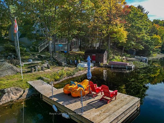 52 Windfall Lake Road - A-Frame Chalet on Water. Enjoy the cozy charm of this A-frame chalet tucked among the trees with 120 feet of frontage on beautiful Windfall Lake. Set on a private 0.25-acre lot this retreat blends comfort and character with two bedrooms plus a loft - perfect for family, guests or quiet weekends away. The kitchen and living area open to multiple walkouts leading to decks where you can relax and take in the water views. Outside enjoy lake life made simple - a bunkie for extra space, a shed for storage, two docks and a dry boathouse. On a private road just off highway 400 this lakeside hideaway offers peaceful seclusion with easy access. A place where mornings start with coffee by the water and end with sunsets over the trees - naturally beautiful, quietly yours.