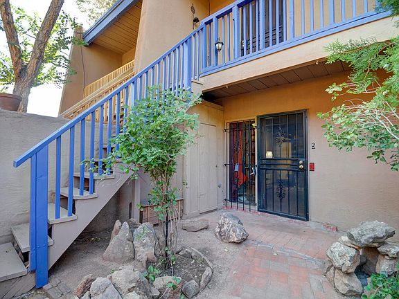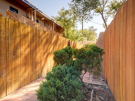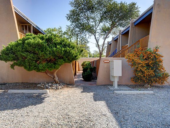 Charming SW Condo complete with brick flooring, and tongue and groove wood beam ceilings with dramatic spiral staircase to upper level. Private courtyard entry, perfectly secluded for morning coffee. Kitchen cabinets have been replaced and storage galore created in this well organized area. Granite tile on counterstops. New skylight in 2023 lights up the stairwell to 2 ample bedrooms. Laminate wood look flooring upstairs. Newer evaporative cooler, new electrical service and new stackable washer/dryer in 2022. Upstairs bedroom steps out onto balcony with stairs to courtyard below. Great location near Old Town, easy to get to Downtown area, UNM, CNM or hospital locations. HOA includes utilities.