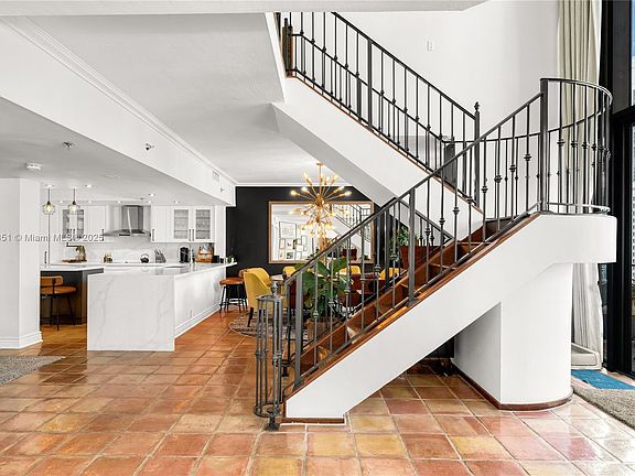 Nestled in Brickell Key, this spacious two-story penthouse blends style, comfort, and convenience. Panoramic views from Downtown to South Beach are a highlight, with grand floor-to-ceiling glass that floods with natural light and two large balconies ideal for outdoor living. The first floor features a modern, open kitchen with high-end appliances and large corner pantry, separate dining and living areas perfect for entertaining, half bathroom for guests, and built-in bar. The upper level offers two generously sized bedrooms with ensuite bathrooms, custom office build-out, and an extra-large laundry room with an additional separate entrance for convenience. Building highlights include 2 parking spaces, storage unit, pool, jacuzzi, sauna, gym, free valet, playroom, 24/7 security, and more.