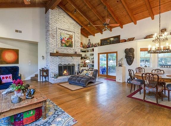 WOW, Sitting on over three acres in the prestigious Persimmon Hill area of downtown Ojai. This five bedroom, three and a half bathroom sprawling ranch style home showcases open beamed vaulted ceilings, a stunning great room with a massive brick fireplace, formal dining room, hardwood floors and a large master suite. The french doors and large windows bring a perfect mix of indoor/outdoor living and stunning mountain views to every window. The magical meandering pathways will lead you to an Artist's studio where you can once again find your creative soul. Plenty of charming areas to gather and enjoy the sensational views of the famous Pink Moment or enjoy a swim under the stars in this completely private estate. Living off the grid is easy with your own private well and solar panels. This slice of Country living offers a prime location all within walking distance to Libby Park, shops, restaurants, and the Ojai Bike/Hike Trail. Horses welcome.