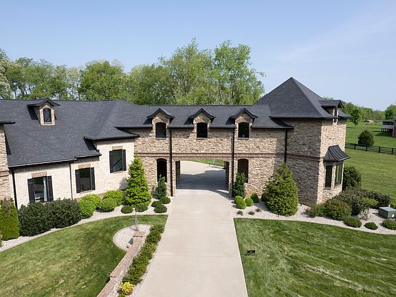 A Timeless Castle Experience! Step into a masterpiece reminiscent of European chateaus with magnificent Gothic Revival and Renaissance influences. This exquisite brick and stone home is designed for those who appreciate artistry and elegance. The stunning 'Stone Serenity' room features 24' tall turret, perfect for gatherings, complete with custom-built forged doors and intricate craftsmanship.The chef's kitchen boasts a double island with granite countertops and a unique pantry door, creating an ideal space for culinary adventures. Experience luxury in the primary suite, complete with a spacious walk-in closet and a spa-like bath featuring a walk-in shower, soaking tub, dual vanities, and direct patio access. Each guest bedroom offers its own private walk-in closet and full bath, ensuring comfort for all. The basement showcases stylish bourbon barrel decor leading to a vibrant game room and a stunning wine bar, perfect for entertaining. A home theater provides the ultimate movie experience.Additionally, a separate guest house offers versatility as a bedroom, office, or gym—ideal for guests or personal retreat. Everything in this home reflects exquisite taste and style. Owner/Agent