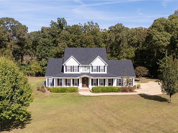A Grand Estate of Timeless Elegance on 20 Serene Acres. Welcome to a captivating retreat where luxury and nature unite in perfect harmony. Nestled on 20 secluded acres, this impressive two-story estate offers 4 bedrooms plus a large office, blending grand architectural features with the warmth of home. Step inside to find soaring ceilings in the living area, a stunning gas log fireplace flanked by custom built-ins, and wiring for surround sound—a feature for both relaxation and entertaining. The gourmet kitchen will delight the chef with its custom maple cabinetry, double ovens, cooktop, dishwasher, microwave, refrigerator, spacious breakfast bar, and an expansive walk-in pantry. A formal dining room and breakfast area create elegant and comfortable dining options. The primary suite, located on the main floor, is a private haven with two walk-in closets, a luxurious jetted tub, and a custom tile shower. The nearby office or fifth bedroom offers flexibility for guests or work-from-home needs. A thoughtfully designed mudroom includes a pet wash—amazing for rinsing muddy boots, cleaning garden tools, or tending to pets. Upstairs, discover three generous bedrooms—one with a private bath and two sharing a well-appointed bath—plus a convenient second laundry room and cozy sitting area. Enjoy the serene beauty of the property from the screened-in porch spanning the entire back of the home, offering breathtaking views of nature and wildlife. Additional features include an oversized two-car garage with storage, two tankless water heaters, and propane service for the fireplace and hot water. Beyond the home, the gated entrance leads to covered RV Parking, a 15x30 office within the barn, three catch pens, fenced pastures, and rich soil for gardening or a new orchard. The property still bears the legacy of its former peach orchard and includes mature fig, chestnut, pear, apple and persimmon trees. This rare estate provides the privacy, space, and grandeur you’ve been dreaming of—a true sanctuary just waiting to welcome you home.