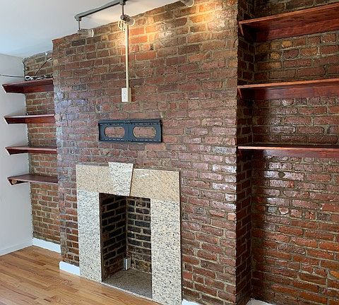 Faux fireplaceExposed brickChic marble bathroomBuilt-in breakfast barHardwood flooring