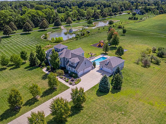 This exceptional two-story home on 3.54 acres exudes luxury and craftsmanship at every turn. The gourmet kitchen is a showpiece, featuring stainless steel appliances, double ovens, a huge center island, quartz countertops, pantry, and a dining area, seamlessly connecting to a three-season room and low-maintenance deck. The main floor also includes a formal dining room with coffered ceiling, a spacious office with a brick accent wall and wall-to-wall built-ins, a massive living room with vaulted ceilings, detailed ceilings, gas fireplace, and custom built-ins, plus a bedroom with a three-quarter bath and a mudroom off the garage with built-in storage. Upstairs, five bedrooms and three bathrooms await, including a primary suite with walk-in closet and tiled steam shower, two bedrooms with a Jack-and-Jill bath, and two additional bedroom with one featuring built-in bunk beds, while the upper-level laundry is set up for two washers and dryers. Beyond the upper level, a third-story cupola provides a serene retreat with built-ins and 360 views of the beautifully landscaped property. The basement offers a sprawling recreation space, a theater room with projector and surround sound, and a third space with a built-in playhouse. Outdoors, the private backyard boasts a heated saltwater pool with slide, built-in trampolines, playground area, fire pit, garden, fruit trees, built-in sandbox and a basketball hoop, complemented by a second detached garage with driveway access. Set within the Duneland School District, this home combines elegance, comfort, and a serene country-like setting, delivering a truly luxurious lifestyle.