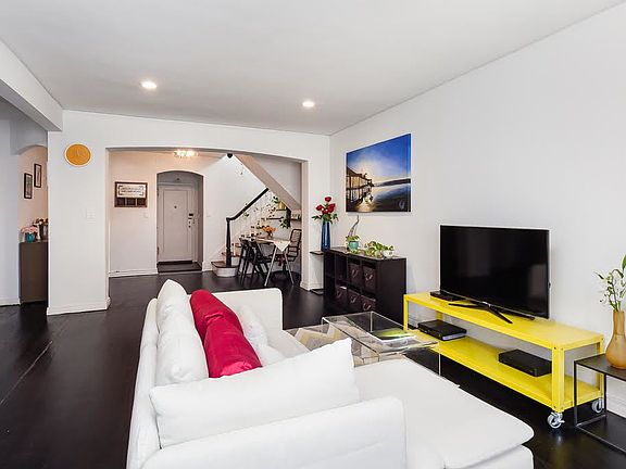 You enter this light-filled modern home with high ceilings through the foyer leading into elegant spacious living room, divided by a pre-war arch into a dining and living area with dark oak hard-wood floors.The oversize window through the living room has beautiful views of the inner garden of the building. The separated windowed kitchen was recently designed and renovated and is equipped with stainless steel appliances including dishwasher, Italian tiled floor, white cabinets with limestone counter tops, red backsplash and two-sided windows for fresh air and extra sunlight. The sunny king size bedroom has two windows and offers spacious custom designed closet. A staircase in the living room is offering an emergency roof access (fire exit) and windowed home office space which make this unit so unique. The bathroom was recently renovated as well and equipped with full size tub, Italian tiled floor and white subway tiled wall with red border.