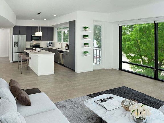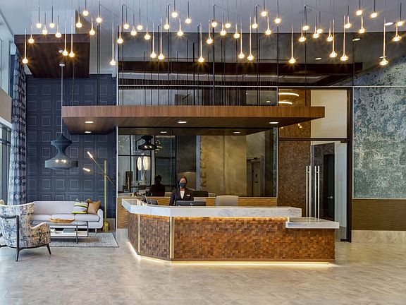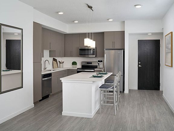 - Exterior features: , 42-inch upper cabinets, Balcony, Bathtub/shower combo, Brushed nickel finishes with modern pull bars, Business Center, Cable included in rent, Classic tile kitchen backsplash, Closet shelving, Coffee bar on 1st floor, Concierge, Conference Room, Corner unit, Courtyard, Decorative bathroom vanity lights, Electric Vehicle charging stations available throu, Foyer, Internet included in rent, Kitchen island, Leasing/Reception on 1st floor, Live/Work units on 1st floor, Meeting rooms, Modern, flat panel grey cabinets, Modern, flat panel mocha cabinets, One bedroom, Outdoor Terrace, Parking Available, Pendant lighting in kitchen, Retail on 1st floor, Single-handle kitchen faucet with pull down spraye, Solar shades, Stainless steel appliances, Stand-alone shower, Study, Surface mount lights, TV Lounge, Three bedroom, Two bedroom, Under cabinet lighting, Undermount, large single basin sink, White quartz countertops, Wi-Fi in Public/Common Areas, Wi-Fi in common areas, Wood-look flooring
