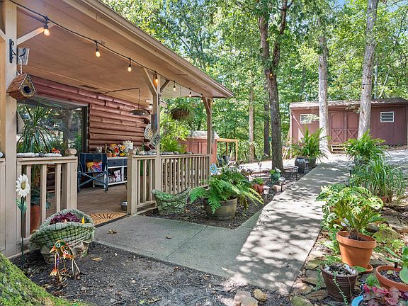 Escape to this enchanting renovated Log Cabin cottage situated minutes from Reinhardt University on 5 private wooded acres! Get away to your own mountain like retreat in this charming 2 bedroom 2 bath open concept home, complete with 2 new bathrooms and new kitchen. The energy efficient structure is an integrated log Cabin design with metal roofing and new HVAC system and beautiful wide plank pine flooring. The main area around the house is fenced and the beautiful natural setting, enhanced with flowering landscape plantings and lighting, leads to the large covered rocking chair front porch. Enter the spacious great room which is the heart of the home, with vaulted ceiling, open kitchen , sitting room with cast iron wood burning stove and dining area. Main hallway leads to secondary bedroom and new full bath with custom barn door. New owner's suite with spacious bedroom and sumptuous new full bath with soaking tub, and separate shower. Back hallway includes laundry room, built in shelving for pantry and storage, back door leads to huge back deck overlooking peaceful wooded back yard, and additionally a long side porch perfect for morning coffee and relaxing evenings. There are 3 separate outbuildings that serve the property. The first is an open covered grilling and smoker structure, great for the outdoor gourmet. The second is a large storage building with space for all you storage needs, and the third is a well equipped planting shed with clear ceiling panels to allow daylight for garden plantings. Completing this amazing property is a flower and vegetable garden area with wood pallet fencing. With 5 absolutely beautiful wooded acres, there are endless possibilities that make 502 George Gray Lane the perfect property for exceptional family living and entertaining!