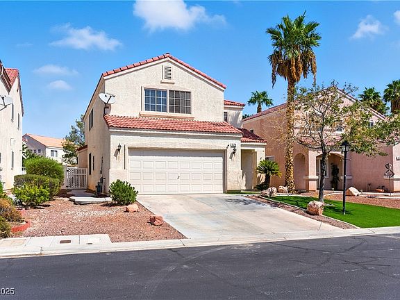 Welcome to 520 Lava Beds Way in North Las Vegas! This 2,224 sq. ft. two-story home sits on a 5,227 sq. ft. lot within a gated community featuring shaded walking paths perfect for pets or exercise. Built in 2001, the exterior is designed for low maintenance with desert landscaping and synthetic grass in both front and backyard. Inside, natural light fills the open-concept main level, seamlessly connecting the living, dining, and kitchen spaces. The kitchen includes a center island with ample cabinetry, generous counter space, and breakfast bar for casual dining. Upstairs, bright windows illuminate the staircase leading to a spacious loft—ideal as a home office, media room, or play area. Step outside to a backyard retreat with a private inground heated pool and spa, covered patio with dual ceiling fans, and outdoor TV mount. A recently replaced A/C unit adds peace of mind. Conveniently located minutes from the 215 Beltway, VA hospital, public library, schools, and shopping.