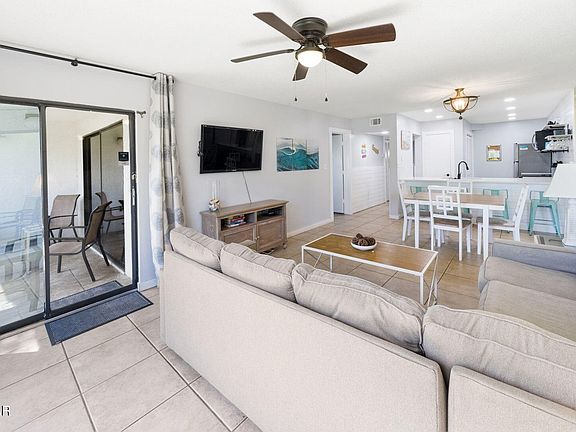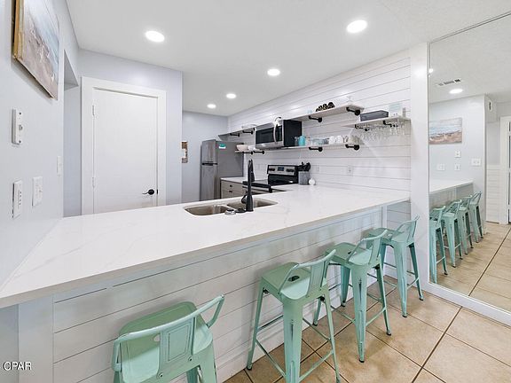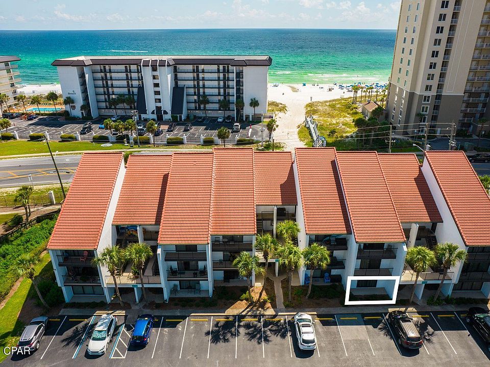 ''This first-floor condo is the perfect base for enjoying the warm Gulf waters and glimmering white sands at Panama City Beach. Superbly located, this gulf-view apartment has updated kitchens and bathrooms with shiplap accents reinforcing the beachy vibe. Tile floors flow throughout the Condo from the charming entrance hallway and living room to the covered porch. Mirrored walls introduce additional light to the living area, which has ample space for a comfy sitting area and dining table. Updated counters in the kitchen extend to create a generous breakfast bar/casual eating area. The kitchen has recently had a facelift with all-new stainless steel appliances and updated cabinets, giving it a fresh, modern look. Louvered doors hide a fully equipped laundry space. An open doorway leads to two bedrooms separated by a family bathroom. The light-filled master bedroom has sliding doors providing direct access to the terrace for morning coffee before the day begins. The ensuite master shower room has been recently updated with a beautiful white double vanity and a fully tiled walk-in shower. The guest bedroom has ample space for two queen-sized beds and also has full-height glass doors leading out to a paved patio overlooking the car park. Just a two-minute walk or tram ride to the private beach, this condo has excellent onsite amenities including golf, tennis and basketball courts, several pools with lounge chairs, hot tubs, and gated security. WonderWorks, a trampoline park and Shipwreck Island are nearby, along with shops, supermarkets, and restaurants lining Highway 98 — all this at a most attractive price point. BRAND NEW AC UNIT!