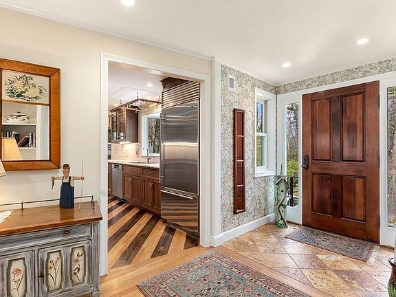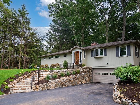 Pristine ranch in excellent commuter location offers move-right-in one-floor living of sun-drenched modern space on 1.08 acres with level backyard. Hardwood floors throughout, updated baths with radiant heat floors, custom built-ins, neutral color palette. Foyer with stone floor opens to living room with wood burning fireplace flanked by cabinetry & wall of windows with woodland views. Dining room has sliders to gorgeous window-lined radiant floor sunroom with glass doors to paver-stone patio. Sunny bay window eat-in kitchen has new Miele stove, Sub-Zero fridge, Bosch dishwasher & granite counters. Primary bedroom has bath/2 closets; 2 additional bedrooms include bay window office with new custom desk/workspace & wall of bookshelves/cabinets. Lower level features family room with fireplace/abundant new closets, laundry & entry to 2-car garage. New septic, lush lawn, attractive stonework steps to front entry, garden shed. Close to commuter rail, major routes, shopping