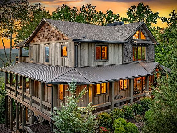 This MODERN LUXURY home was showcased in the Blue Ridge Parade of Homes and blends rustic elegance with some of the most breathtaking, multi-layered MOUNTAIN VIEWS in all of Blue Ridge. Thoughtfully designed & built by Kevin Teague this home is unlike any other! Featuring 4BR, 4.5BA, 5 fireplaces and a 42-foot illuminated, see-through glass catwalk, lit w/multiple changing colors, soaring high above the great room.Themain level showcases an open-concept floorplanw/soaring ceilings, dramatic lighting, plus ahandcrafted white ash spiral staircase connecting all three levels and is anchored by a dramatic 3-story chandelier. Accordion doors allow the living area to connect seamlessly to the grand fireplace porch offering outdoor dining with SUNSET VIEWS! Well appointed kitchen (Viking appliance package). Themain-level suite boasts mountain views and a spa-like bath. Lglaundry room & powder room also on the main. Upstairs primary suite has a private viewing porch, cozy fireplace, custom en-suite bath w/hammered copper soaking tub and an oversized walk-in shower. Just beyond the suite is an open loft connecting to the catwalk offering one of the most spectacular long-range mountain views. On the terrace level, enjoy a wet bar designed for wine lovers, stamped concrete floors, fireplace, and entertaining space. A custom bunk room w/three built-in queen beds, and a 4th bedroom with extra-high ceilings and a shared full bath for additional guests. (Home sleeps 16 comfortably.) Outside is a grand fireplace patio, hot tub, and professional landscaping featuring gorgeous stonework & a firepit gathering, perfect for evening relaxation under the stars. So many special features, including a Savant smart home system, Generac generator, built-in surround sound throughout & more. Offered FULLY FURNISHED this masterpiece is a must-see for the most discerning buyers seeking a true luxury mountain retreat. Located less than 10 min. from Downtown Blue Ridge in "Blue Ridge Heights".