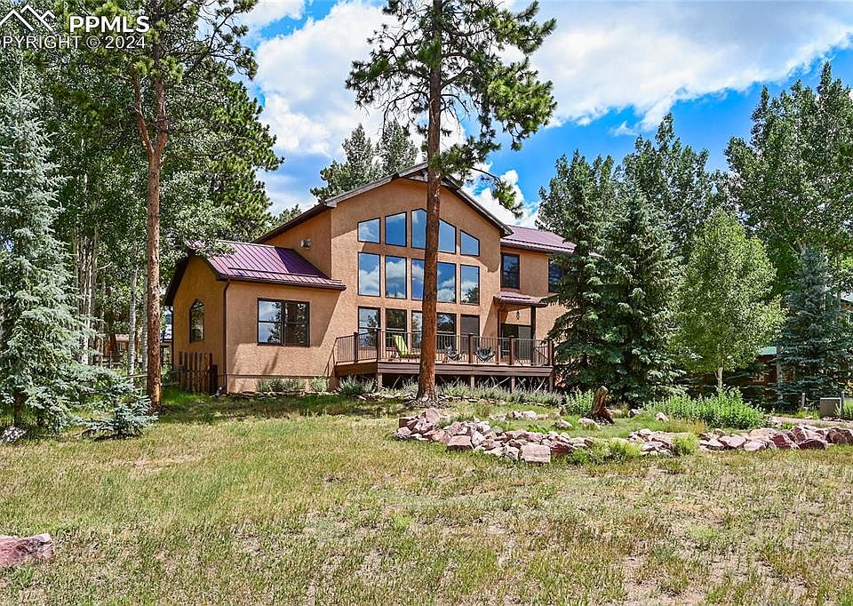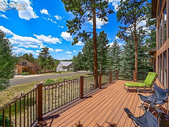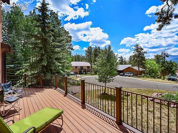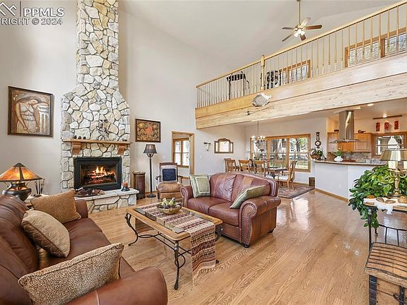 Step into this magnificent 2-story home with breathtaking views of Pikes Peak. The moment you enter, you'll be captivated by the dramatic 2-story great room, featuring a wall of windows showcasing the stunning mountain views and a beautiful stone fireplace. The open floor plan, adorned with hardwood floors, seamlessly connects the updated gourmet kitchen, complete with granite countertops and stainless-steel appliances, to a spacious dining area. Adjacent to the great room, a bright and roomy office with a walkout to the backyard offers a perfect space for work or a creative studio. The main level boasts a luxurious primary suite with an updated 5-piece bathroom, a convenient laundry area, and a powder room. Upstairs, you'll find a huge loft with a panoramic view of Pikes Peak, two additional bedrooms, and a full bathroom. Located on a quiet cul-de-sac, this home is just minutes away from local schools, shopping, restaurants, and downtown Woodland Park. The yard is beautifully landscaped with natural touches, including pine trees and perennials. Enjoy the fenced backyard with a patio, perfect for relaxing or entertaining. Come and experience the best of Woodland Park living in this stunning home!