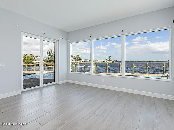 BEST WATERFRONT VIEW ON SYKES CREEK!! Indulge in the epitome of stunning water views and modern design. This 2020 new build offers 4 bedrooms, 3 full baths and one 1/2 bath. The interior elegance includes a coastal kitchen which was tailored to enhance the beauty of the surrounding waterfront. A true testament to both style and practicality! SS appliances, walk in pantry, pot filler, gas range, and beverage cooler! The upstairs offers a large balcony to relax or watch the rocket launches. The view from the upstairs Primary bedroom is nothing short of breathtaking! Wait until you see the Primary bathroom - mesmerizing! Upstairs you will find an en suite also with a full bath that is exquisitely designed. The exterior presents a one of a kind 50ft. poo with surrounding brick paver deck. The 8,000lb boat lift and deck is a boater's dream. Other special features include tankless water heater, metal roof, impact windows and sliders, and well water for irrigation. Book your showing now! This is not just a home, it's a lifestyle!