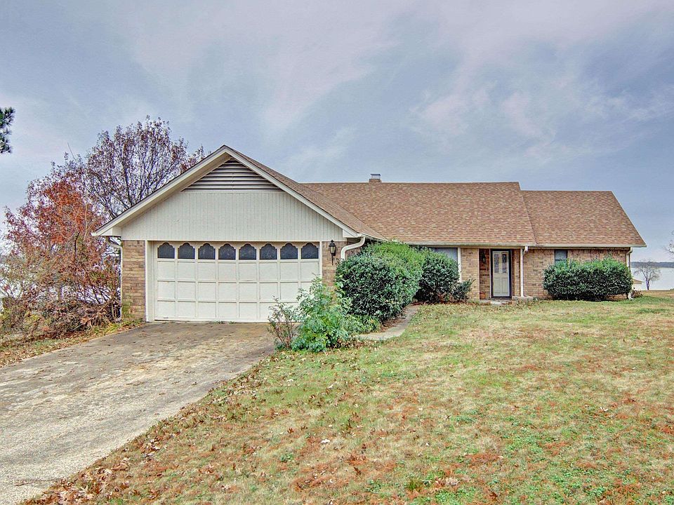 Investors and renovators, here’s a rare opportunity to own a true Lake Fork fixer-upper with exceptional potential. Located at 520 RS CR 3445, Emory, TX 75440, this brick home was built in 1985 and sits on a fantastic waterfront lot with expansive lake views and unforgettable sunsets. The property is in one of the earliest established subdivisions on Lake Fork and is conveniently situated directly across the street from the Lake Fork Golf Club. The home features two bedrooms, two baths with a vaulted ceiling and an open-concept layout connecting the kitchen, dining area and living room. Parquet flooring runs through the entry and main living spaces, while carpet and linoleum are found in the bedrooms and baths. The all-electric kitchen offers an abundance of cabinets for storage, Formica countertops, and no formal pantry due to the extensive cabinetry. A brick-framed WBFP with an insert (possibly pellet) anchors the living room, which includes brick and paneling accents, with wallpaper throughout other areas of the home. Heavy popcorn ceilings are present in the home. The vaulted living room ceiling shows discoloration at the apex, and the parquet flooring appears to be heaving, indicating foundation movement that will require attention. Mechanical systems include one electric water heater and a single HVAC unit. Outdoor features add to the value and potential of this property. A large screened-in patio provides ample entertaining space, though most of the screens are missing and will need replacement. A small shed offers workshop or storage use. The enclosed single-slip boathouse features strap lifts and a manual roll-down door that is currently damaged. At full pool, water depth at the end of the pier approaches nine feet, making it ideal for boating and fishing. Offered as-is, this home is clearly in need of repairs and updates, but the lot, location, lake access, and views make it an exceptional opportunity to create a custom lake retreat or investment property.