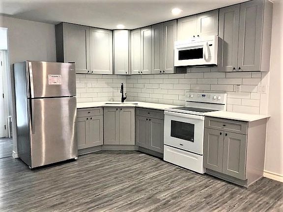 Wood laminate floorsLarge fully fenced yardCentral heat and airGray cabinetsCorian countersSuper cute kitchenSubway backsplash