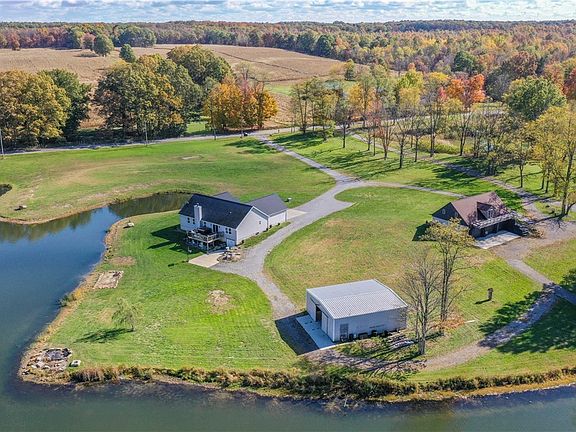 Experience the perfect blend of luxury, comfort, and country living with this stunning lakefront ranch set on nearly 11 acres of serene landscape and FREE GAS! Enjoy a private lake, a 36x40 5-stall horse barn, and endless views of nature from every angle. Inside, the home welcomes you with a massive open great room featuring exposed beams and a breathtaking floor-to-ceiling stone fireplace. The spacious eat-in kitchen offers the ideal gathering space with a cozy breakfast area overlooking the water. The primary suite includes a private ensuite bath and walk-in closet, while two additional bedrooms sit on the opposite side for added privacy. A first-floor office and laundry room add everyday convenience. Step outside onto the expansive back deck and take in the panoramic lake views—perfect for relaxing or entertaining. The full walk-out basement provides endless potential for a recreation room, gym, or workshop. 2 car attached garage! An additional parcel offers a beautifully finished 32x48 three-bay garage with an upper loft, full kitchen, and bathroom—perfect for use as a guest house, in-law suite, or creative retreat. This property truly has it all—space, privacy, beauty, and functionality. Schedule your private tour today and experience this extraordinary lakefront retreat for yourself!
