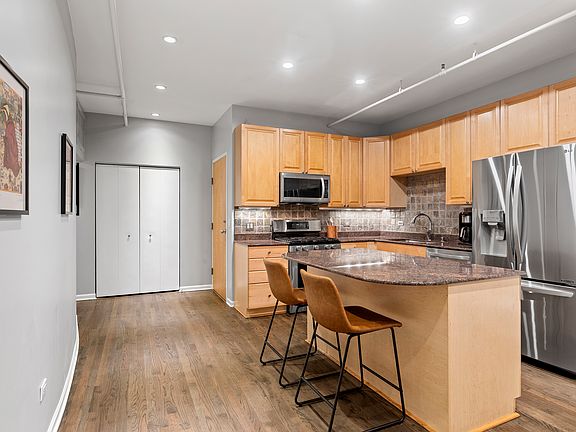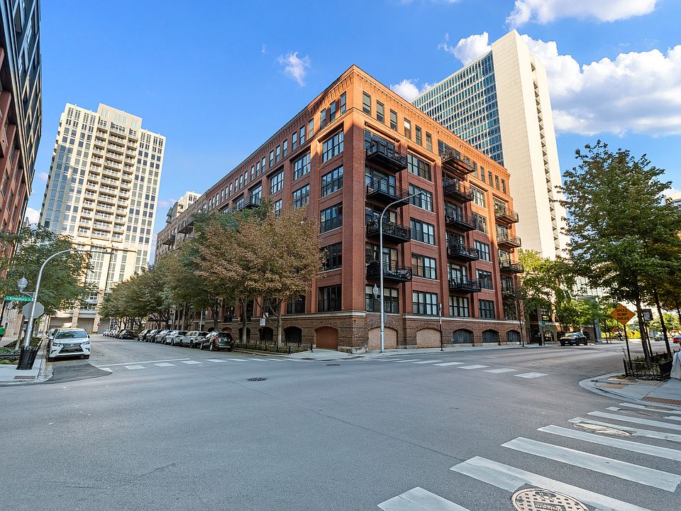 Welcome to city living in the heart of River North. Experience one of the largest one bedroom layouts in the building, offering an open and inviting floor plan with abundant organized storage throughout. The spacious living area features updated hardwood floors, a cozy gas fireplace, and an updated deck-perfect for grilling and entertaining. The kitchen boasts maple cabinetry, granite countertops, updated stainless steel appliances, and a generous granite island ideal for cooking and gathering. Tall ceilings and exposed brick add character and warmth to the space. The large bedroom includes updated double closets with custom organization, private access to the updated bathroom, and an in-unit washer and dryer. The full-amenity building offers a 24-hour doorman, fitness center, and additional storage space. Heated garage parking spot available for $200/month. Located steps from the Dog Park, River Walk, East Bank Club, restaurants, shops, and entertainment, with easy access to the Brown Line, expressways, and downtown.