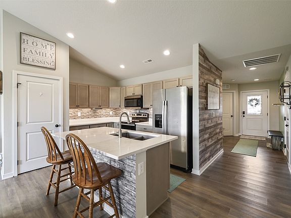 Open-concept layoutVaulted ceilingsLarge windowsSpacious kitchenDining areaFamily roomWarm earth tones