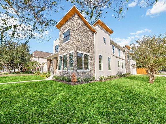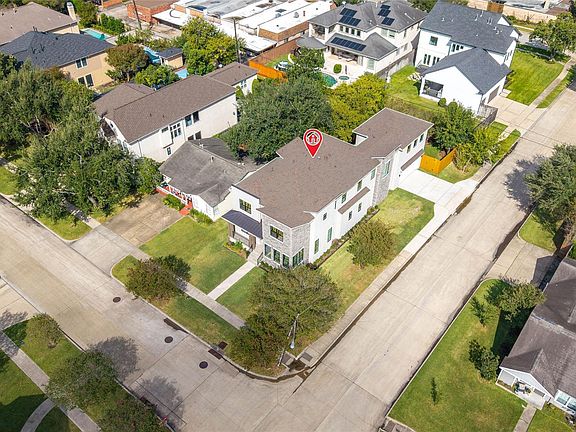 Nestled on a desirable low-traffic corner lot, this exceptional new build blends timeless mid-century modern design with luxury finishes. Designed for both functionality and style, the home features 5 spacious bedrooms (1 down, 4 up) - each with its own ensuite bath - plus 2 half baths, a private corner study, an expansive gameroom with its own snack bar and powder, and a versatile flex space. The open-concept main level connects the living area seamlessly to the chef’s kitchen, showcasing custom cabinetry, gorgeous natural quartzite countertops, and a butler’s pantry that links to the formal dining room. Premium upgrades include: 48” Thermador appliances, Full spray foam insulation, High-efficiency 2-stage HVAC systems, Aluminum windows & Multi-slide doors offering unobstructed views of the backyard. Zoned to top-rated Bellaire schools, this home combines refined modern living with everyday convenience - an exceptional opportunity in one of Houston’s highly sought-after neighborhoods.