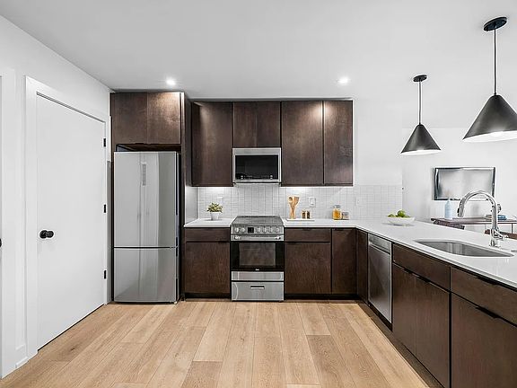 -Kitchens with quartz countertops, stainless steel appliances, mocha cabinetry, tile backsplashes, pendant lighting & garbage disposals
