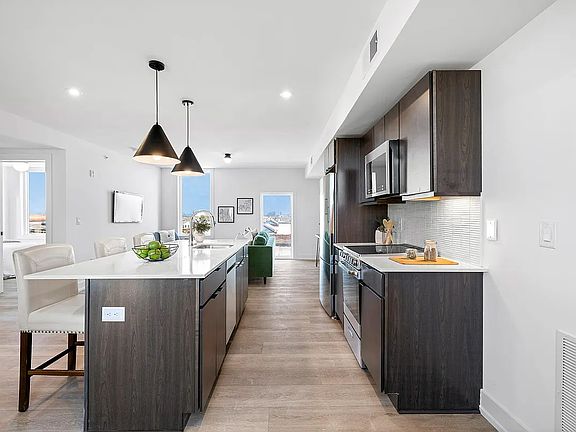 Stylish mirrorsKeyless entryRooftop deckWide plank oak flooringKitchens with quartz countertopsIn-unit laundryFitness center and sauna