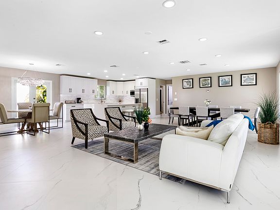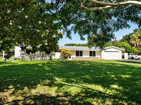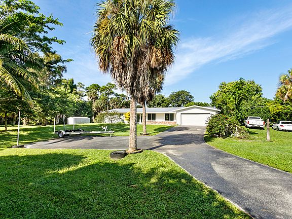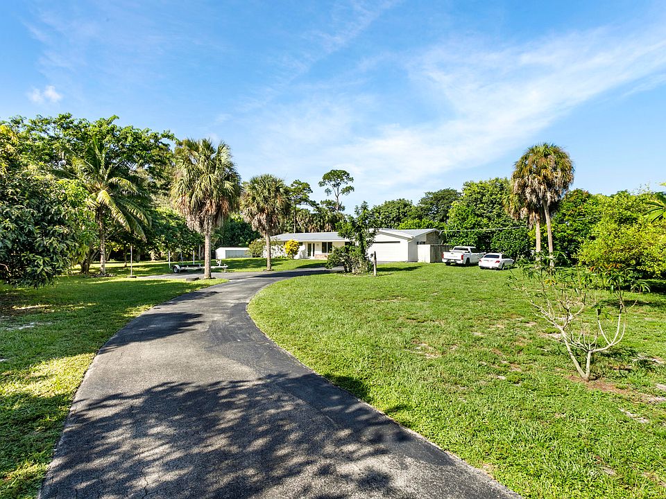 A rare opportunity awaits in Haverhill Riding Estates with this 2.11 acre property offering endless possibilities. The parcel provides potential for a 6-7 new single home development or the enjoyment of a private residence that sits on 1/2 acre and is surrounded by over 91,900 sf of lush grounds filled with mature fruit trees. Whether you envision development potential or a serene private retreat, this property delivers. The existing CBS home 4 BR, 3.5 BA, 2-Car Garage has been fully renovated and designed for modern living. Highlights include 32x32 porcelain tile flooring, 8' ceilings with recessed LED lighting, and smart home features throughout. The open-concept kitchen boasts a quartz island, Carrera marble backsplash, solid wood shaker cabinetry, and Samsung SS appliances. A spacious family room with abundant natural light flows seamlessly into the dining and kitchen areas, creating an inviting space for gatherings. The primary suite offers generous dimensions, a large closet, and a beautifully updated bath with frameless glass shower and tub/shower combo. Two additional bedrooms share a full bath with double vanity and tub/shower. A flexible en-suite bedroom/home office offers the ideal space for guests or work-from-home needs, plus a powder room. Additional features include impact windows, a metal roof (2013), newer A/C (2021), water heater (2015), and a two-car garage with laundry and storage space. The expansive property provides room for a pool and ample space for parking recreational vehicles, boats, or trailers. No HOA restrictions.