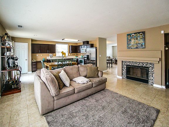 Welcome home to this open & bright single story home featuring a bright and open floor plan! This home is nestled on a corner lot with a paver walkway to the back & a covered front porch area! Upgrades in this home include neutral paint, mirrored walls, tile and laminate floors. There is a formal living and dining room combo upon entering with a custom chandelier and an extra storage closet! This cozy family room offers views of the backyard, a wood burning tile fireplace with mantle & private desk/study alcove. Enjoy preparing meals in the spacious kitchen w/beautiful dark cabinets with custom handles, S.S. appliances, double sink, dining area and large pantry. Each bedroom in this home has custom paint & mirrored closed doors! Relax in this bedroom suite w/ a walk-in closet, spa-like master bathroom with dual sinks and shower over tub. Large paver patio, paved side yard (ideal for boat or RV parking), low maintenance landscaping, citrus trees and a storage shed.