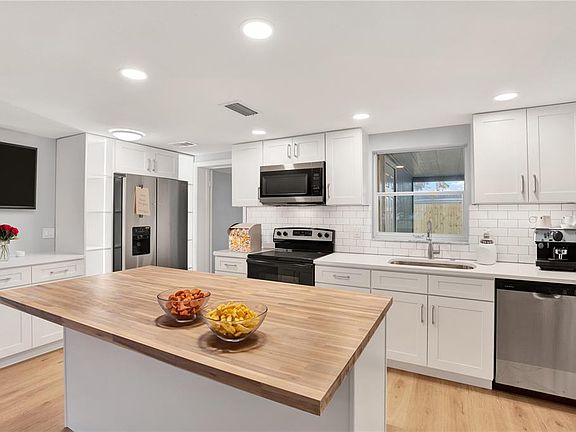 One or more photo(s) has been virtually staged. One or more photo(s) has been virtually staged. NO FLOODING and NO FLOOD ZONE HERE! Photos have been virtually staged. This beautifully UPDATED 3-bedroom, 2-bathroom home offers the perfect blend of modern convenience and cozy charm with New Flooring. Enjoy a bright and spacious living room featuring brand-new modern-style cabinets with LED lights inside. The Modern Kitchen is adorned with beautiful newer cabinetry, Granite countertops, a stylish backsplash, and new appliances. A rich wooden island adds an element of aesthetic and elegance. The home boasts TWO Remodeled Bathrooms, complete with beautiful new vanities, updated lighting, stylish tile, and more—allowing you to move in and enjoy all the upgrades already done for you! The ENTIRE exterior and interior have been freshly painted, ensuring a CLEAN and refreshed look. A NEWER FENCE provides privacy, while mature landscaping creates the perfect outdoor setting for pets and activities. Additionally, the freshly painted 1-car garage includes a washer and dryer for your convenience.