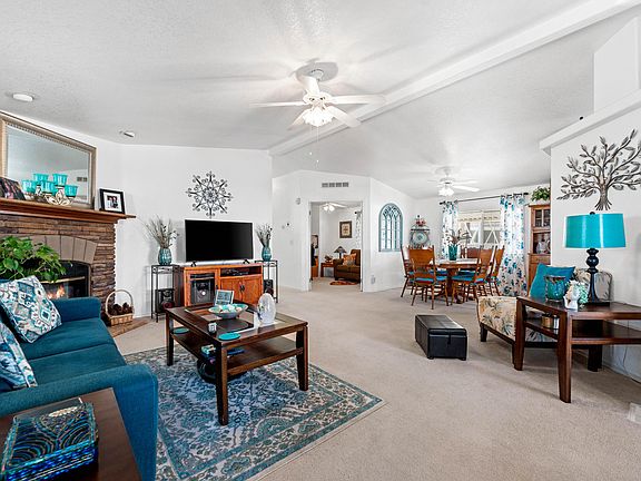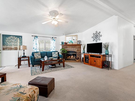 As you approach this home, you'll be greeted by its well-maintained exterior, characterized by a clean and contemporary design that perfectly complements the views of the Mountains. Step inside and be captivated by the fresh ambiance created by newly updated flooring and paint throughout. The living room offers an inviting, open space, and the beautifully brick updated fireplace, setting the scene for cozy fall nights. The open kitchen is a culinary enthusiast's dream, fully equipped with appliances, including a stove and dishwasher. Its clean and stylish cabinets feature an abundance of storage space to meet all your cooking desires. Retreat to the master bedroom, where you'll find an attached bathroom with a luxurious soaking tub and shower combo. Outside, a generously sized semi-enclosed patio area awaits, providing the perfect setting for outdoor gatherings and BBQs, all while relishing the lovely surroundings, The lush backyard is perfect for all of your entertaining desires. This well maintained mobile home is part of a private community offering 24-hour security, a refreshing pool, a playground area, a fitness room, and a clubhouse for you to enjoy. Don't miss the chance to call this beautiful home yours, situated within a highly desirable gated community where tranquility and luxury await.