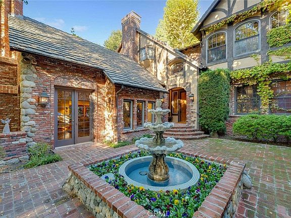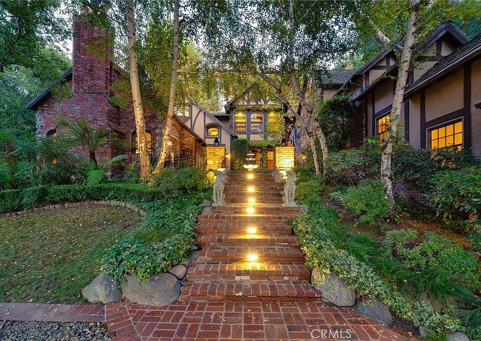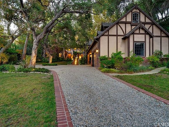 Nestled behind private gates on approximately two acres of beautifully manicured, park-like grounds, this stunning English Tudor estate offers 7,516 sq ft of timeless craftsmanship and refined elegance. From its classic timber-beamed and brick exterior, to its intricate interior woodwork, open vaulted ceilings with exposed wood beams, and stained and beveled glass windows, every detail reflects the character and grace of a bygone era—perfectly blended with modern luxury. A grand formal entry welcomes you into a two-story foyer that opens to an expansive floor plan featuring a step-down living room with a dramatic floor-to-ceiling stone fireplace, a large formal dining room, and multiple gathering spaces ideal for entertaining. The gourmet kitchen is complemented by granite countertops with custom cabinets, island with prep sink, a butler’s pantry with wet bar, walk-in pantry, and premium appliances including Sub-Zero, Thermador, and KitchenAid. Unique spaces such as a charming potting room, large craft room, upstairs bonus/play room, separate office/library, and a game room with pool table add character and versatility. There is truly plenty of space for everyone!
