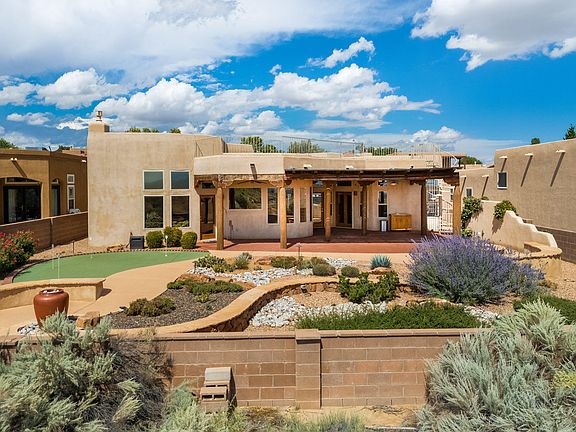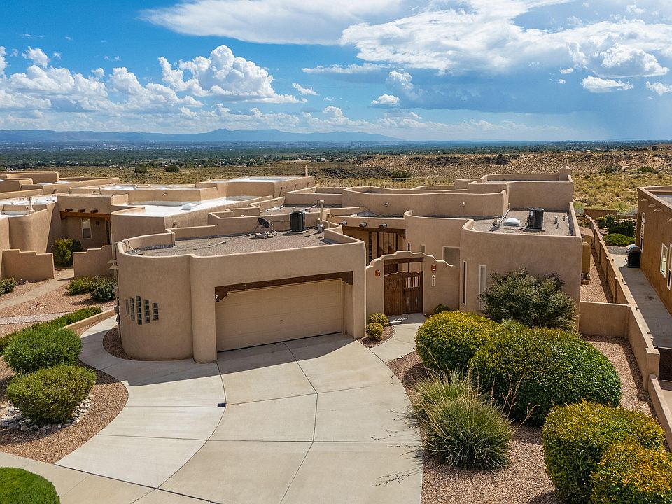 Fantascular Pueblo Custom is a year-round Staycation Paradise high above the Rio Grande Valley, enjoying unblockable views of the Sandias, the downtown skyline & the Manzanos beyond, situated adjacent to the Petroglyph Nat. Monument Open Space. Ascend the circular stairway to enjoy your private panorama from the rooftop deck, or just relax under the large portal & watch the high desert in motion before your eyes. Custom cabinetry, designer closet amenities, chef's kitchen, hobbyist's dream garage & storage galore..there isn't a thing missed in this one! Private Paradise Bluffs neighborhood that provides security, access to nearby hiking trails, shopping/transportation, & a balloon viewing perch without the crowds! Puttng green, water features, fire-pit, killer floorplan..it's beautomous!