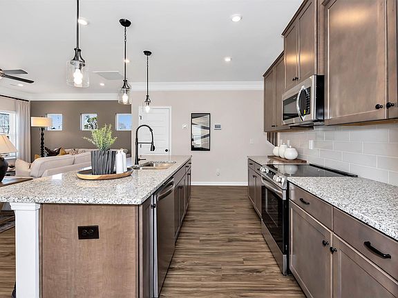 Step into The Braselton II at Newfound Ridge, where comfort and style come together. A covered rear corner patio, easily accessed from the bright family room, offers the perfect outdoor retreat. The spacious eat-in island kitchen, which overlooks the family room, is designed for effortless entertaining. Upstairs, a large loft provides a central space, with the owner's suite tucked away for added privacy. The owner's suite boasts a massive walk-in closet, a luxurious private bath, and an extra-large standing shower. Two secondary bedrooms complete the second floor, with convenient access to the laundry room. Photos are representations.