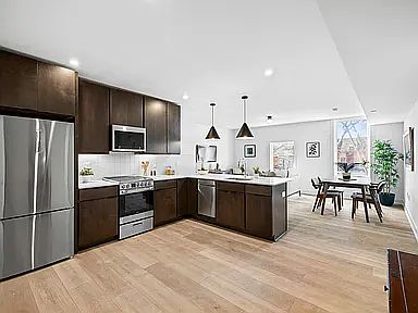 Welcome to a stunning, recently constructed apartment building offering the best of contemporary urban living and designer finishes. This modern residence features an open-concept living space with beautiful wide-plank flooring and ample recessed lighting throughout, creating a bright and airy atmosphere. The gourmet kitchen is a focal point, boasting sleek cabinetry (available in two-tone white and gray or darker wood finishes), premium white quartz countertops, full stainless steel appliances, and stylish tile backsplashes (subway or small horizontal tiles). Bedrooms are spacious, feature generous closet space (some with sliding doors), and plenty of natural light from large windows. The high-end bathrooms offer a serene, spa-like experience with designer tiling (marble look, large format gray, or patterned mosaics), modern vanities (some floating wood, some white shaker style), and bright light fixtures. A standout feature is the inclusion of private outdoor space, with many units benefiting from a private balcony or a small patio/yard space on the ground level, perfect for enjoying a morning coffee or some fresh air. Located in a thriving, walkable neighborhood, this property offers excellent access to public transit, local dining, and convenient shopping.