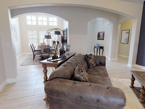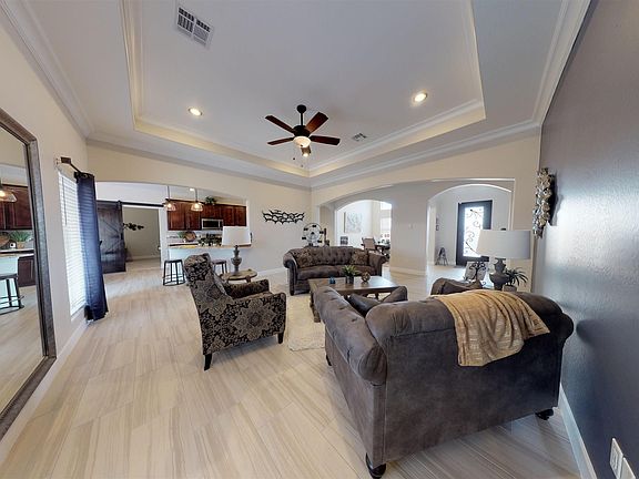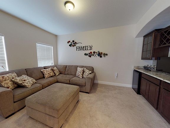 The Patricia Plan by Stuard Homes. This home has endless options with it's flex room that is used as second living area or theater room with a dry bar and fridge. Large open living and front dining room with vaulted double tray ceiling with eat-in kitchen and bar. Vaulted ceiling in great room. This Patricia includes upgrades such as exterior stone on front of home, stainless steel appliances, upgraded cabinetry and laundry cabinetry, upgraded iron door, upgraded tile throughout great room, wet areas dining, and halls, upgraded granite and upgraded tile on shower wall, insulated and finished garage, ceiling fan in living room, recessed can lighting in living and master bedroom and soffit lighting in eaves, extended concrete at patio. Home is on an oversized, corner lot. Oil rubbed bronze fixtures and faucets throughout. This home also has a dry bar, barn door, french doors at 3rd bedroom, and blinds throughout the home.