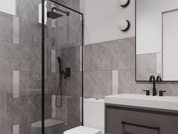 2 cozy bedrooms are tastefully appointed with sconces and huge west-facing windows. A shared bathroom is tastefully appointed with bespoke tiling and luxury fixtures.