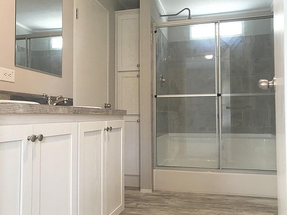 Fenced yardCarpet in bedroomsLots of storageSplit bedroomsDining areaRustic vinyl floorsScreened door