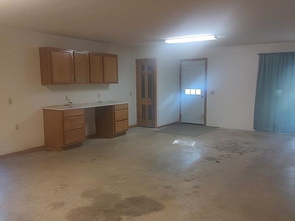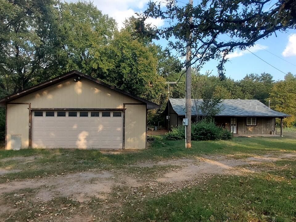 Selling 'AS IS'. Lots of potential for this open living floor plan. Ready to add your personal preference on decorating. Galley kitchen with stove and dishwasher. Cement floors ready for your choice of flooring. Storm shelter. Detached 24x32 garage with garage door opener plus interior walls have sheetrock. Watch the wild life on the 5 acres with lots of trees. Check out the aerial view to appreciate the lot. Call Brenda for showing today at 580.251.0278.