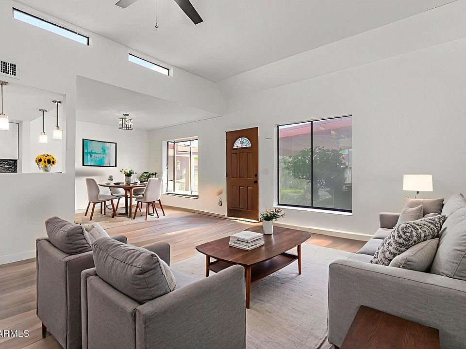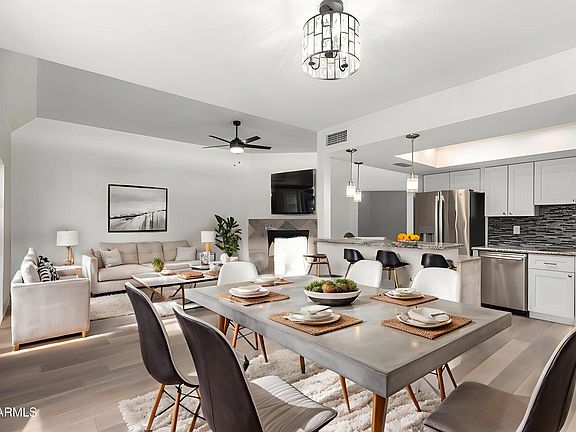 Welcome home to this beautifully updated 2-bedroom plus enclosed den, 2-bath patio home tucked in the heart of Phoenix. Surrounded by mature trees and lush landscaping, this gated community offers both a pool & dog park! Inside, nearly everything has been refreshed in recent years, including updated lighting throughout, new paint and flooring, and remodeled bathrooms with new cabinets, countertops, vanities, mirrors, and accessories. The kitchen was fully renovated in 2020 and features granite counters, stainless steel appliances, and an open layout overlooking the spacious living area with a cozy fireplace.