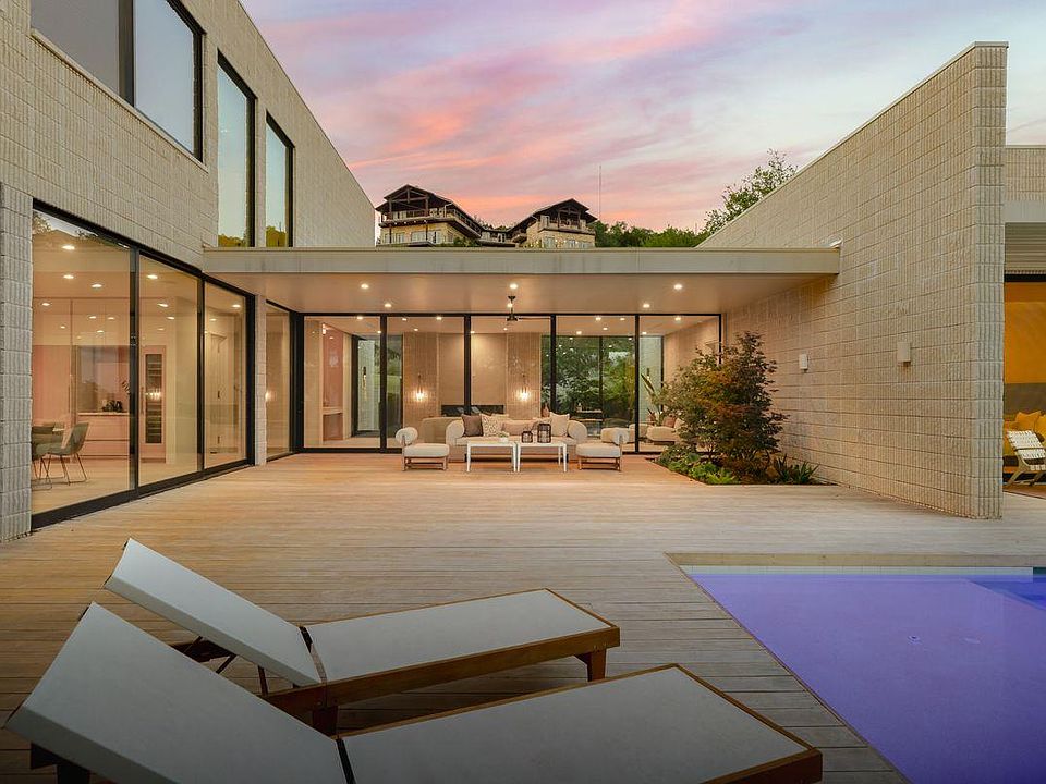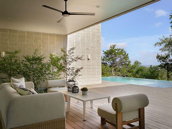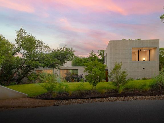 Perched elegantly on Scenic View Drive, this architectural gem showcases Austin's downtown skyline in spectacular fashion. The prestigious West Lake Hills location offers both sanctuary and accessibility—an ideal equilibrium for the discerning homeowner. This meticulously crafted residence spans over 4,100 square feet of refined interior space, harmoniously complemented by more than 1,300 square feet of sophisticated outdoor living areas. Constructed with concrete masonry units, the residence delivers exceptional structural integrity and thermal efficiency, resulting in diminished maintenance requirements and substantially reduced energy consumption. Proprietors will appreciate insurance premiums estimated at 30-40% below those of comparable traditional dwellings. Expansive floor-to-ceiling windows frame the captivating downtown vistas throughout the home, while clean architectural lines and a thoughtfully conceived open floor plan create an ambiance of serene sophistication. The layout encompasses three distinct living environments that transition effortlessly between interior and exterior spaces. The culinary space features premium Gaggenau appliances, including integrated refrigeration, professional-grade ovens, and a dedicated wine refrigerator. Bespoke built-ins and custom cabinetry throughout the residence provide both aesthetic distinction and practical functionality. The exterior domain is anchored by a stunning infinity-edge pool that creates a visual merger with the horizon, while an elevated private deck above the primary suite offers an additional vantage point for savoring the luminous cityscape below. Contemporary amenities include comprehensive data connectivity, integrated sound systems, strategic recessed illumination, and soaring ceilings that enhance the spatial experience. This exceptional property represents the quintessential synthesis of architectural excellence and practical luxury—a rare opportunity to acquire a truly distinctive residence.