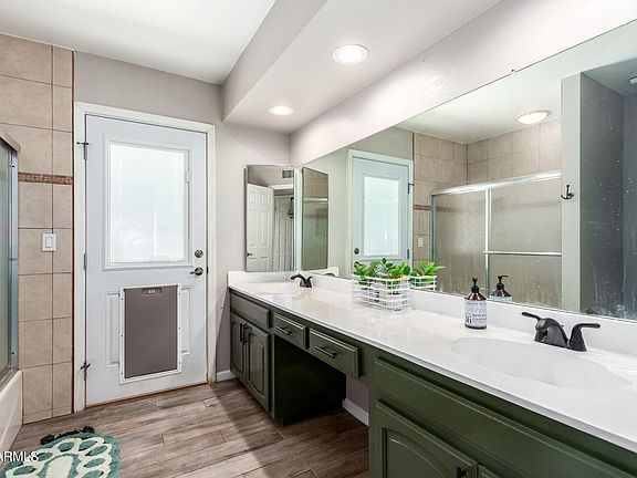 Welcome to this vibrant corner lot! You'll be impressed by this energy-efficient 4-bedroom residence with an RV gate in Glendale! Bountiful natural light graces every corner, from the inviting living & dining room to the large family room offering sliding glass doors to the back patio. Impeccable kitchen comes with recessed lighting, plenty of cabinets, SS appliances, quartz counters, tile backsplash, and a peninsula that adds to the counter space. Romantic main retreat is equipped with wood-look tile flooring throughout, direct outdoor access, a walk-in closet, and an ensuite with dual sinks. Secondary bedrooms provide bi-folding closets. Generous-sized backyard shines with its covered patio, pavers, and a refreshing pool, making it the ideal spot for year-round entertaining. Don't miss! Solar owned and completely paid off!!