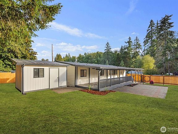 Fully remodeled 3-bedroom, 2-bath home on an oversized, fully fenced double lot with double gates, offering plenty of room for RV parking, gardening, or play. Wide-plank vinyl flooring flows throughout, complementing a spa-inspired primary suite with full bath and generous closet space. The chef’s kitchen shines with stainless steel appliances, quartz countertops, and stylish two-tone cabinetry. A spacious covered front deck is perfect for year-round entertaining, while a paver patio invites cozy nights by the fire. A large detached shop and shed provide versatile storage or workspace, and private lake beach access makes every season feel like a getaway.