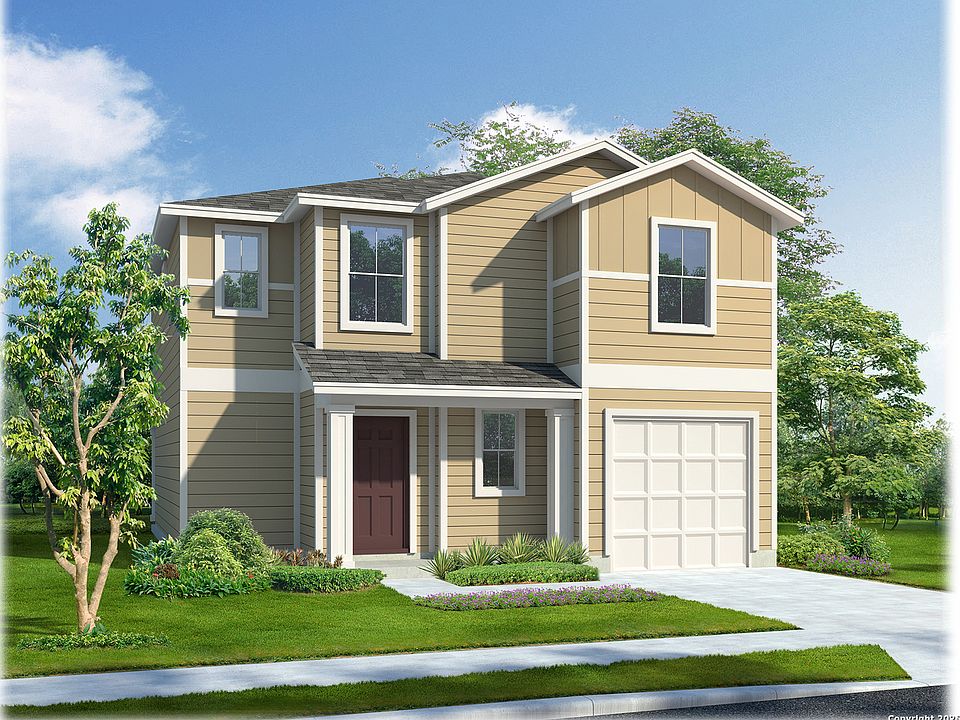 The Bowie plan is one of our two-story homes featured in our Riverstone at Westpointe community in San Antonio, TX. This new home layout offers 3 classic front exteriors, 4 bedrooms, 2.5 bathrooms, a 1-car garage and 1839 square feet of comfortable living. An inviting front porch invites you to step inside The Bowie where you will find a foyer opening to a combined living room, dining room and kitchen area. You'll enjoy preparing meals in your modern kitchen with stainless steel appliances, quartz countertops and shaker style cabinets. Spend time together gathered around the large kitchen island with plenty of workspace and room for bar seating. A spacious loft or game room is located at the top of the stairs, providing plenty of room for countless game nights or movie nights. You will also find all bedrooms and a second full bathroom upstairs. Located toward the back of the home, your primary bedroom features an attractive attached bathroom with a combined bathtub and shower, a single vanity sink with a spacious quartz countertop and a walk-in closet. Head back downstairs and find an under-the-stairs storage closet, a spacious laundry room and a covered patio (per plan) located off the back of the home, perfect for relaxing and enjoying your fully landscaped and irrigated yard. Additional features of The Bowie include sheet vinyl at entry, downstairs living areas and wet areas and quartz countertops and shaker style cabinetry throughout the home. This home includes our HOME IS CONNECTED base package. Using one central hub that talks to all the devices in your home, you can control the lights, thermostat and locks, all from your cellular device.